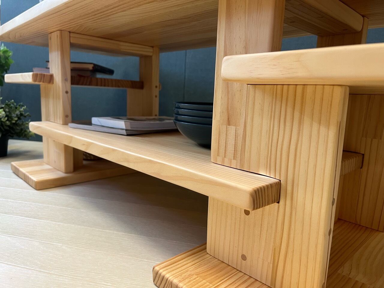 ◎切り欠いた縦板に棚板を差込んで固定する事により、デザイン性や機能性だけではなく見た目の美しさを両立しました。