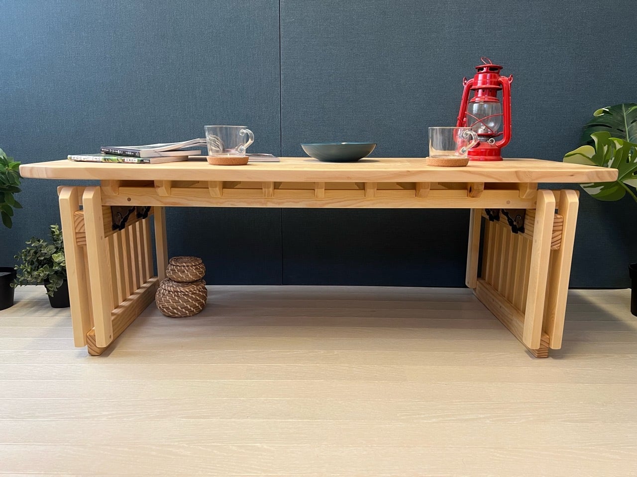 ◎やぐらの様な木組みデザインを天板裏に配置し、脚には縦格子を採用しました。