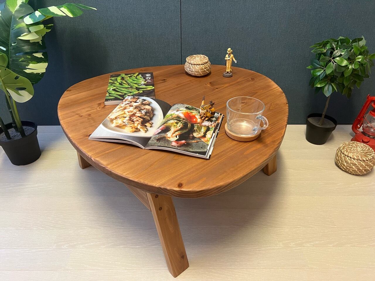 ◎荒々しい木目が目を惹く、杉材を天板に使用したおにぎり形のテーブルです。