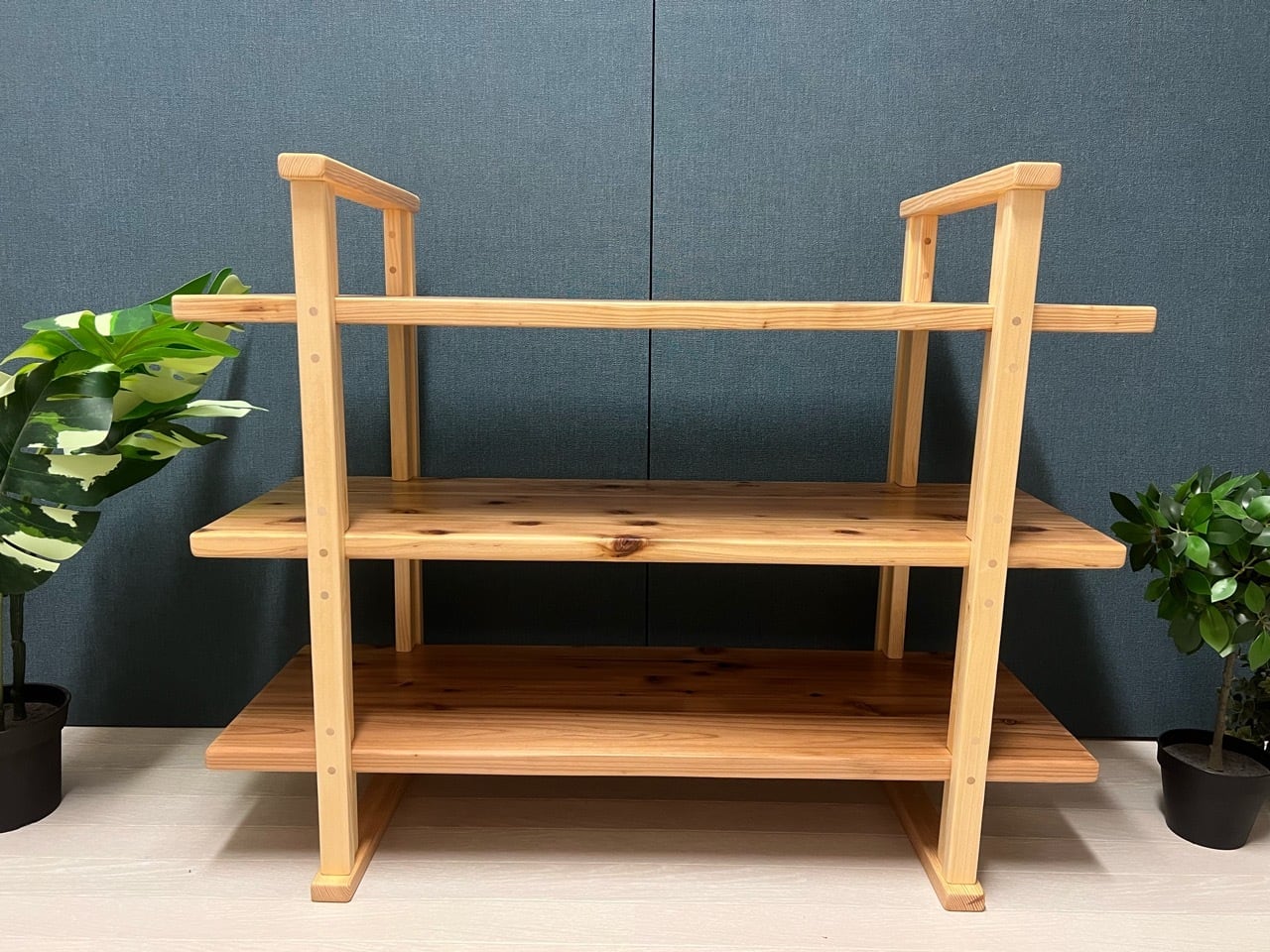 ◎荒々しい木目がかっこいい杉材の棚板を、同じくナチュラルな4本の支柱でしっかりと支える造りとしました。