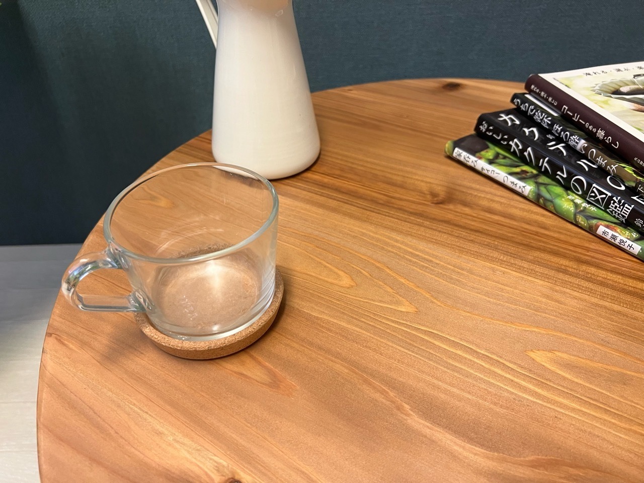 ◎荒々しい木目が目を惹く、杉材を天板に使用した丸いテーブルです。