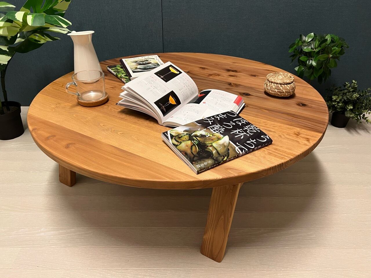 ◎荒々しい木目が目を惹く、杉材を天板に使用した丸いテーブルです。