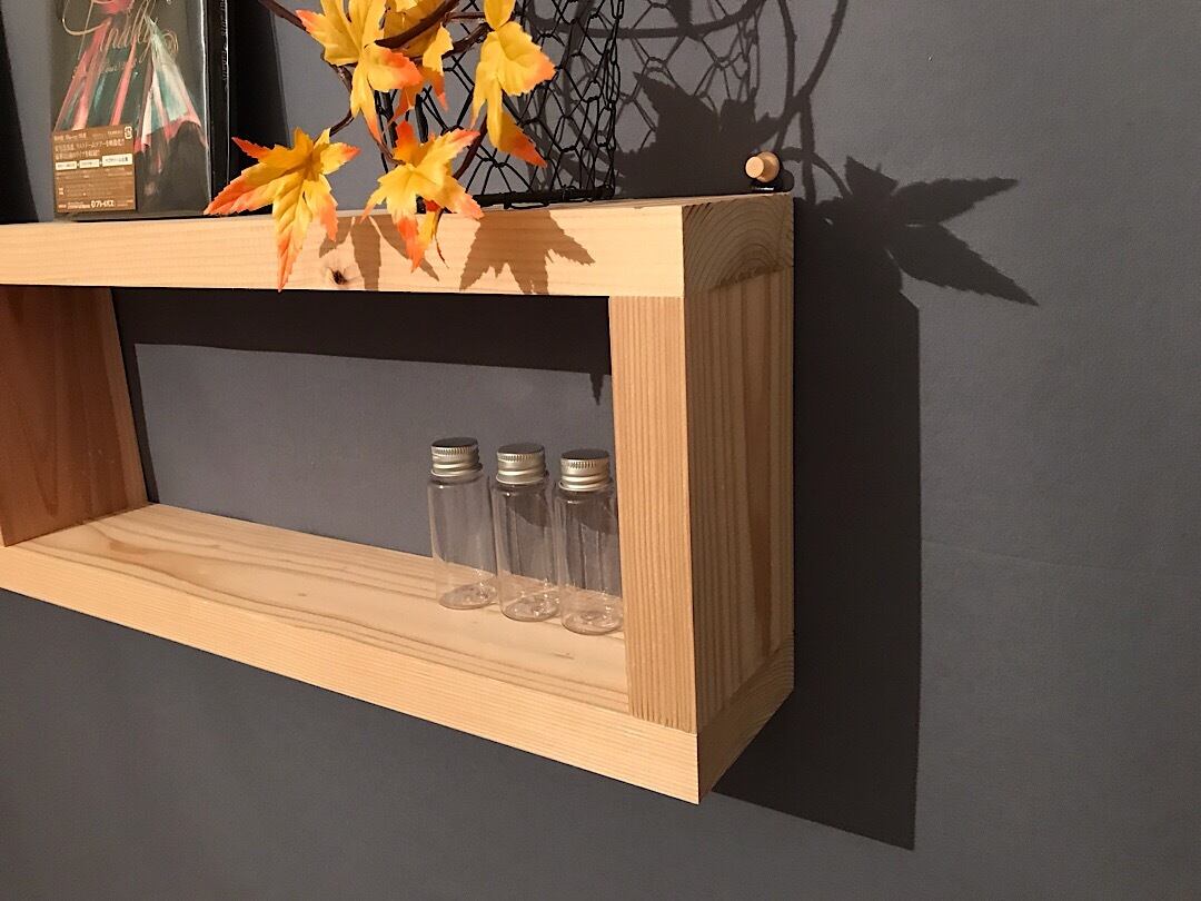 ◎木目が美しい杉材を使用した、ロ形のウォールシェルフです。