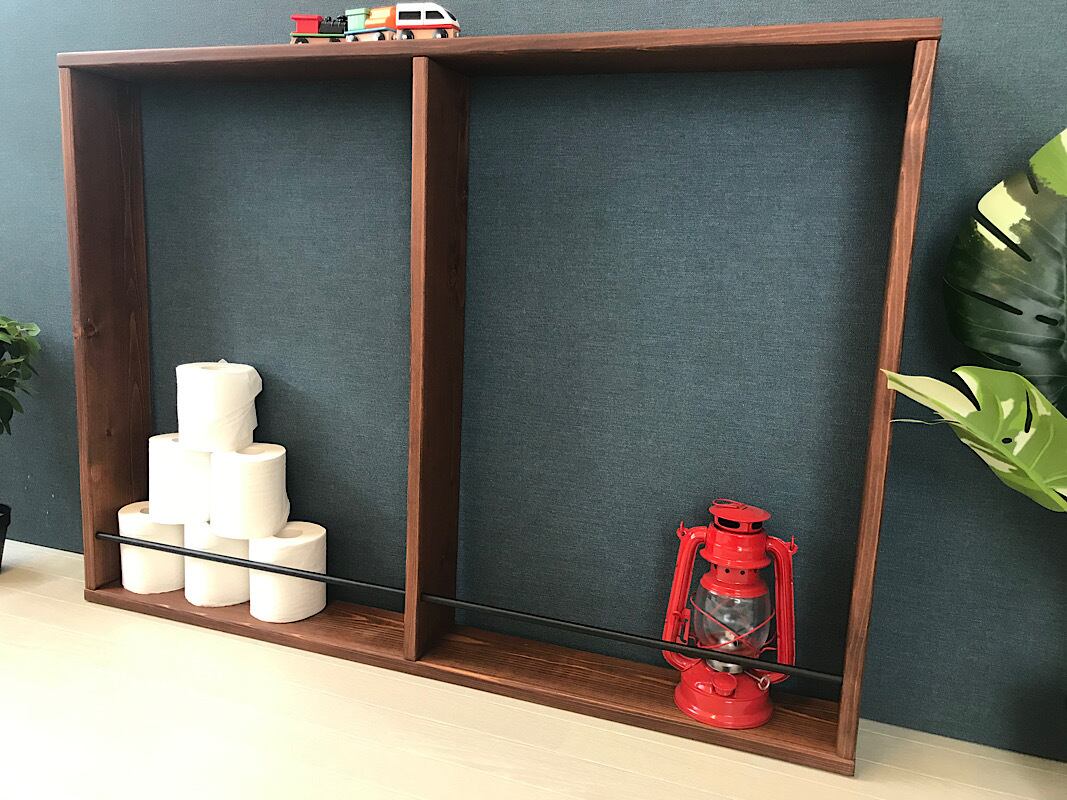 ◎置く物の落下防止対策として、下段にブラック塗装を施した丸棒を取り付け、アンティーク調にしてみました。