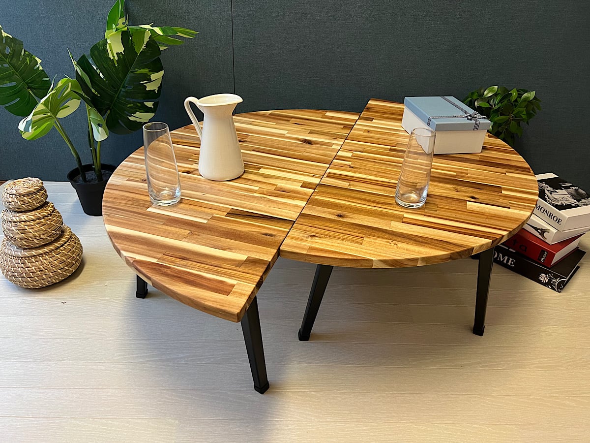 ◎丸形の天板を2分割し、それぞれ独立して使える様に脚を付けました。