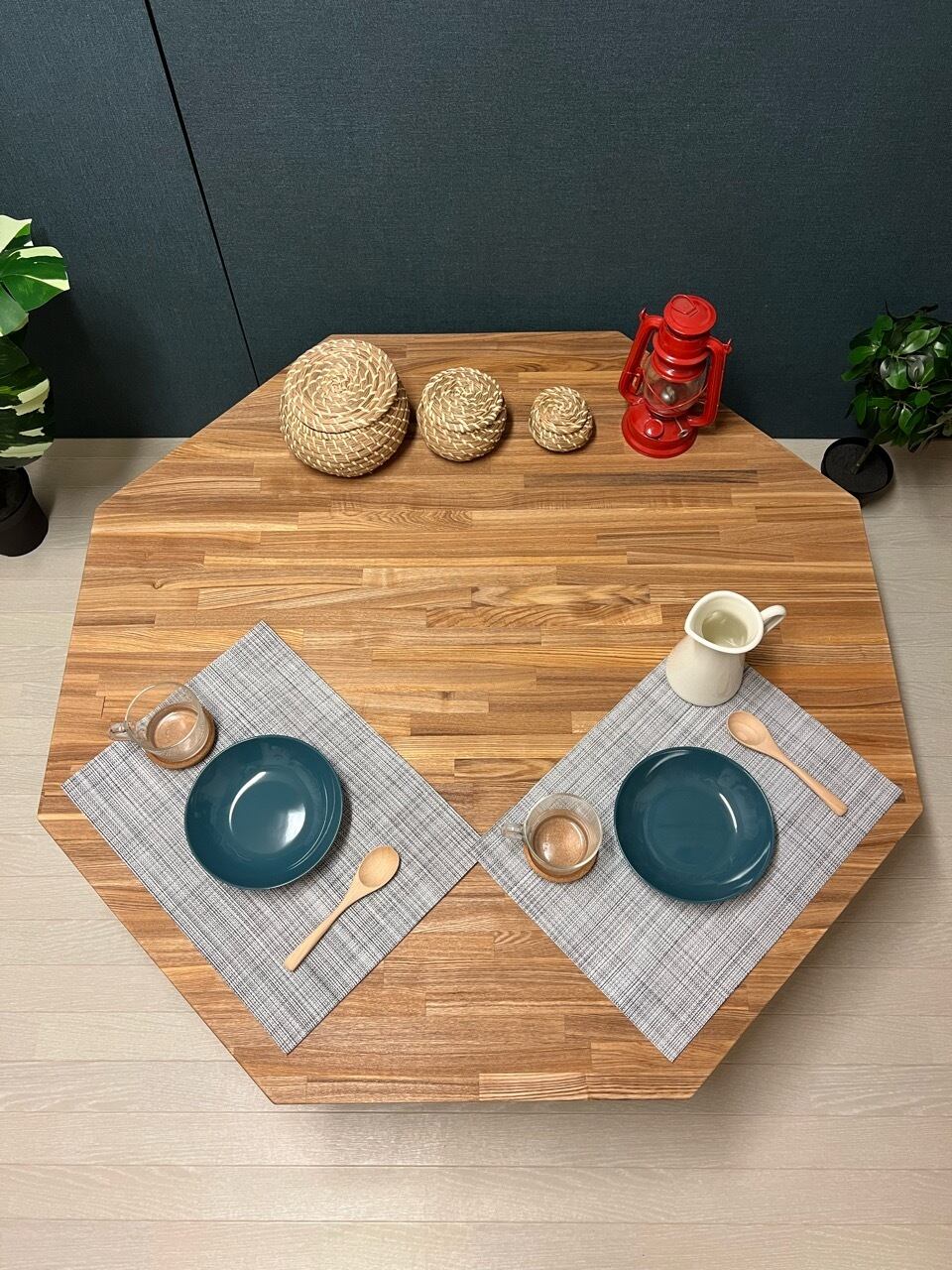 ◎どこにでも合う色味のタモ材を使用した8角ローテーブルです。